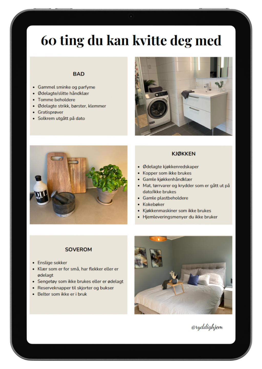 Her finner du enkle hjelpemidler som gjør det lettere å komme i gang med ryddingen. Last ned, skriv ut og bruk dem i din egen hverdag – helt gratis.