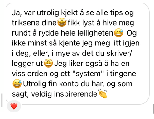 Jeg har alltid hatt en stor interesse for rydding og organisering. Orden og systemer har vært en naturlig del av livet mitt helt siden jeg var liten. Samtidig har jeg alltid hatt et ønske om å hjelpe andre, og jeg motiveres av å se når mennesker opplever mestring og utvikling.